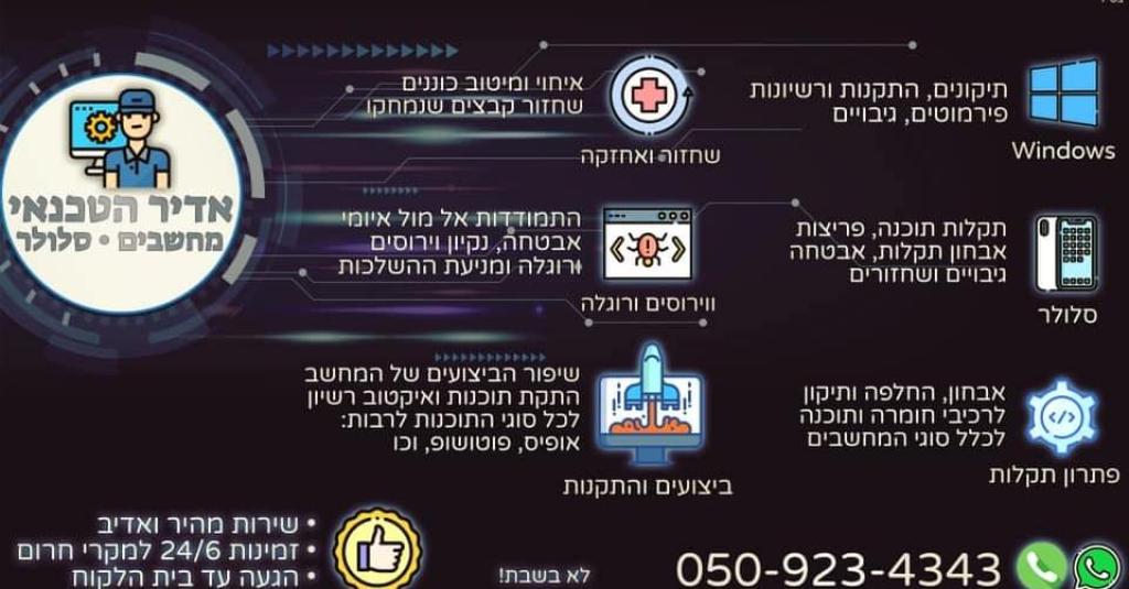 אדיר הטכנאי - טכנאי מחשבים וסלולר פתרון כל תקלות חומרה/תוכנה לכלל המחשבים פתרון כל תקלות התוכנה לכלל הסלולרים מתן מענה אבטחתי אל מול וירוסים ורוגלות שיפור ביצועי המחשב ואופטימזציה התקנת כל סוגי התוכנות פלוס רשיון במחיר סמלי