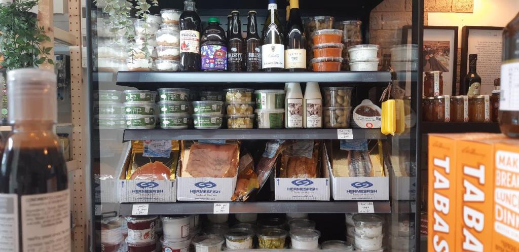 בית לגבינות ישראליות ומיובאות מובחרות, דגים מעושנים, סלטים במשקל, סלט ביצים, כבד קצוץ, עלי גפן ממולאים, ריבות ויינות טובים
