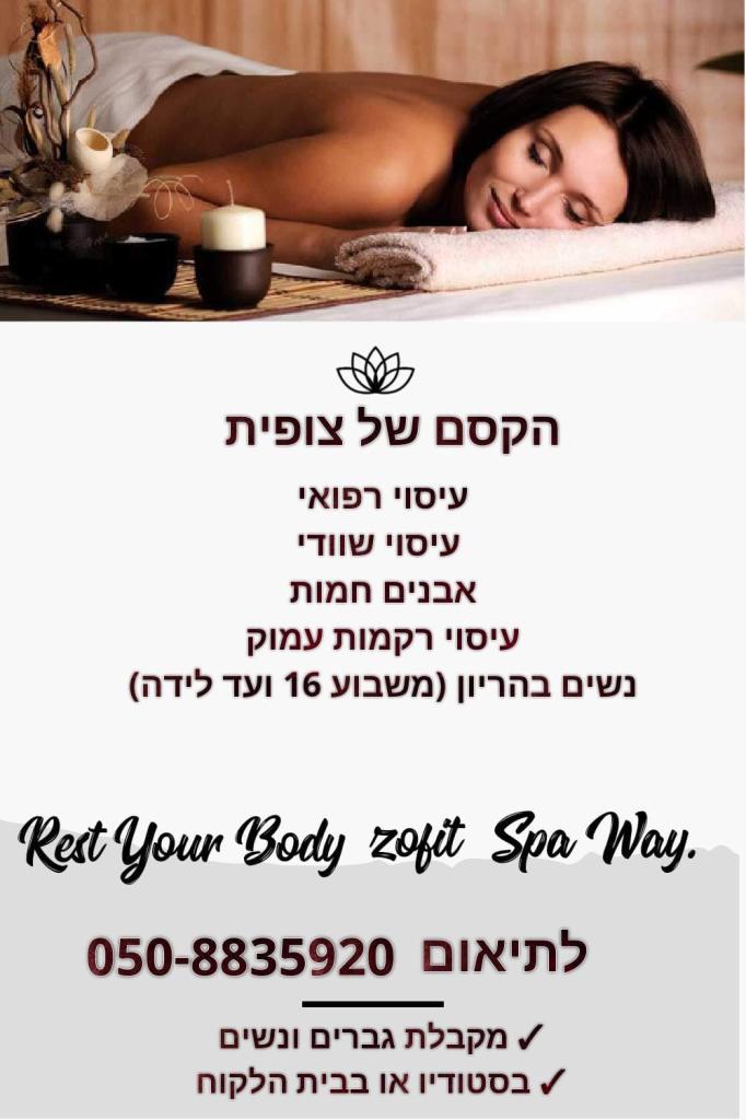 צופית, מעסה מקצועית בוגרת מכללת רידמן לרפואה משלימה. מתמחה במספר סוגי עיסויים. טיפול בקליניקה או בבית הלקוח