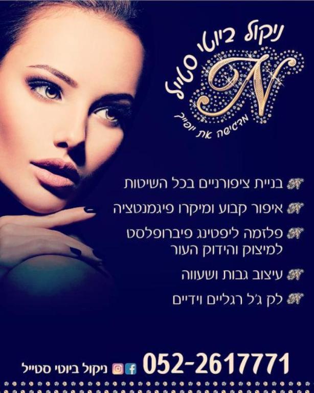 מעל 23 שנה במיקצוע וממשיכה להתמקצע ליעל ולשפר הכל למענכם.... ציפורניים בכל השיטות והסוגים. שזירת ריסים. איפור קבוע בכל השיטות החדישות. עיצוב וסידור גבותפדיקור. פלזמה ליפטינג למתיחה והרמת עפעפיים. שיזוף בהתזה. לק ג'ל. עיסוי לפנים וטיפול יופי ע"י כוסות רוח ועוד ועוד