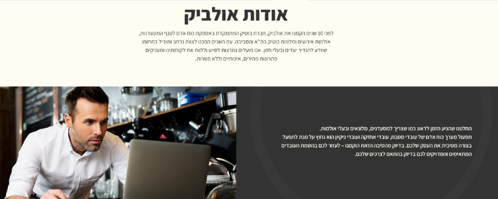 אולביק המתמחה באספקת כוח אדם למטבחים מסחריים בתחום המסעדנות, מלונאות בת"א והסביבה. החברה מספקת שוטפי כלים למסעדות, עוזרי טבח, עובדים כלליים להכנות במטבח ועובדי ניקיון אולביק מתחייבת בפני לקוחותיה למתן מענה זמין, מקיף, יסודי ומהיר של עובדים זמניים או מקצועיים, בהתאם לדרישות הלקוח.