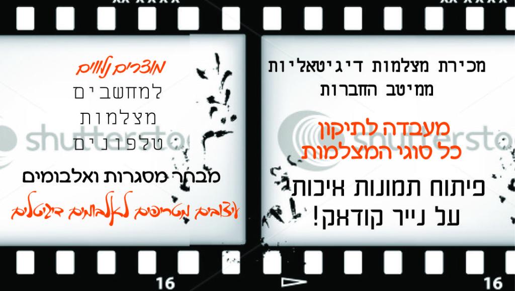 המרות של כל סוגי הסרטים כולל קלטות שמע ולקובץ דיגיטלי ----- פיתוח תמונות. גם דרך הווצאפ אפשר לשלוח מבחר מסגרות במחיר ללא תחרות, רסטורציה- תיקון תמונות ישנות ופגומות בעבודת פוטושופ מקצועית. ספריית DVD עשירה ונוסטלגית.