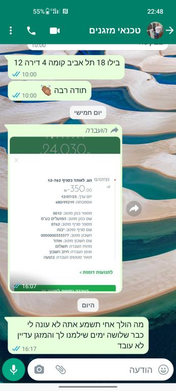 פשוט ביזיון בעקבות נזילה במזגן הגיע לתיקון וכל מה שהוא עשה זה למרוח איזה חומר ואמר שהבעיה תיפתר לאחר שהחומר יתיבש . לאחר כמה שעות טובות כפי שהוא המליץ הפעלתי את המזגן והנזילה לא הפסיקה מאז הוא מסנן אותי אומר שיגיע ובסוף לא בא פשוט לקח כסף והולך מבלי לקחת אחריות מקצועיות ביזיון שירות ביזיון לא ממליץ לאף אחד טכנאי כזה אם אפשר לקרוא לו כך